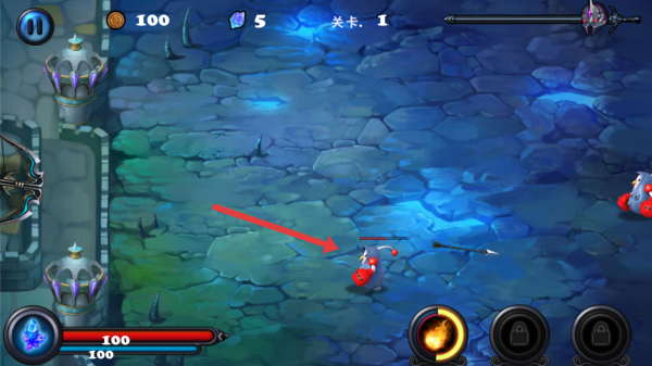 1、进入关卡一,沿箭头方向进行追击红色的敌人,用基本的射击来攻击,注意躲避敌人反击,积累金币资源。
