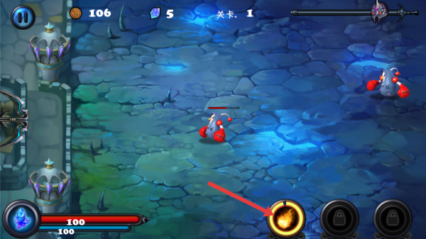 2、战斗中,在敌人靠近时也可以点击黄色的火焰的技能,释放技能快速清怪,为了节省血量,提升战斗效率。