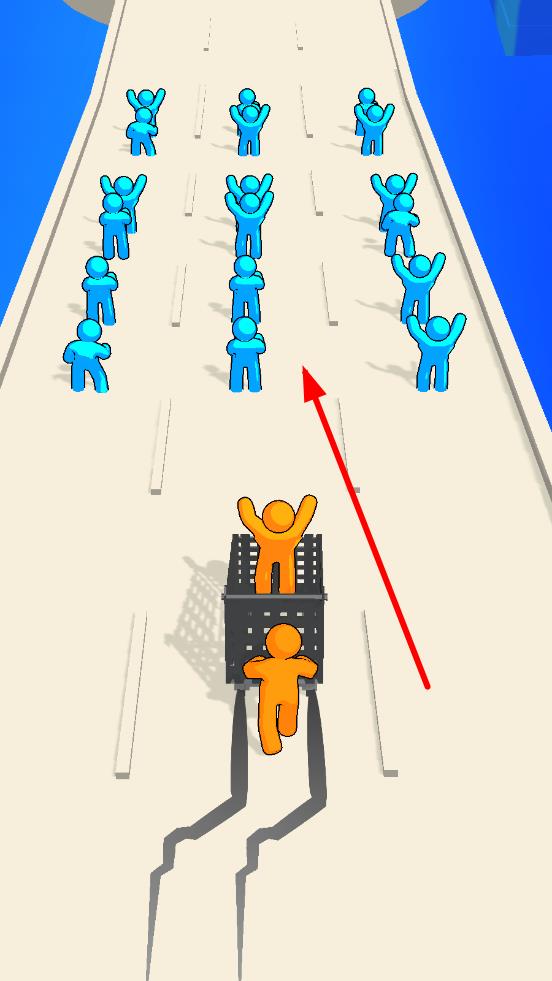 1、进入关卡,操控橙色角色推小车前进,吸纳蓝色人群,规划蓝色人群多的路线,优先收集,快速扩充队伍规模。