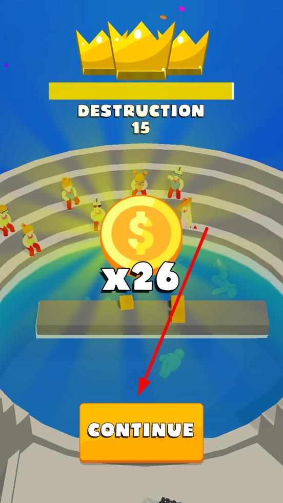 3、评价足够高的话,将会获得三星的评价,显示DESTRUCTION评分与金币奖励,点击CONTINUE进入下一关。
