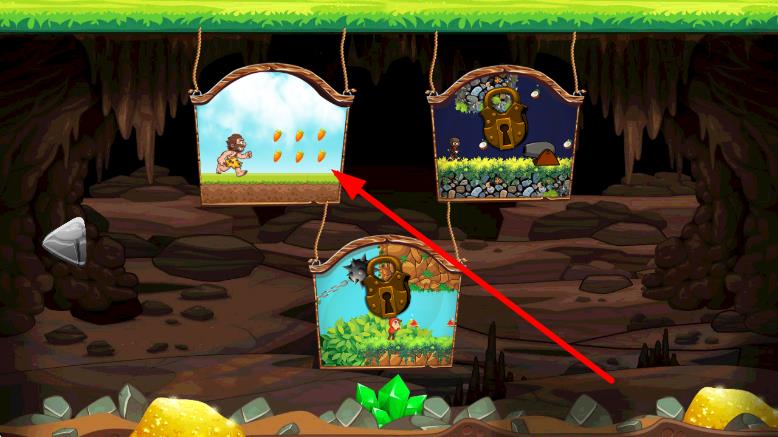 2、在关卡选择界面,点击箭头指向的未锁关卡,进入对应场景,帮助原始人收集胡萝卜,避开障碍,挑战关卡内容。