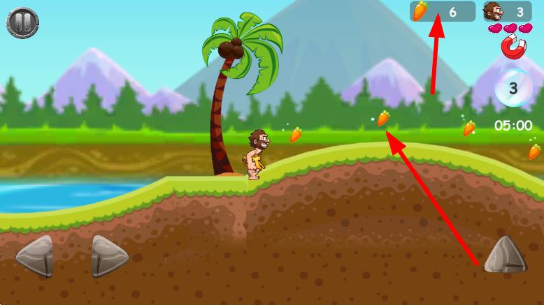 3、操控原始人奔跑,沿箭头方向拾取胡萝卜,注意地形,利用跳跃避开障碍,积累胡萝卜数量,达成目标。