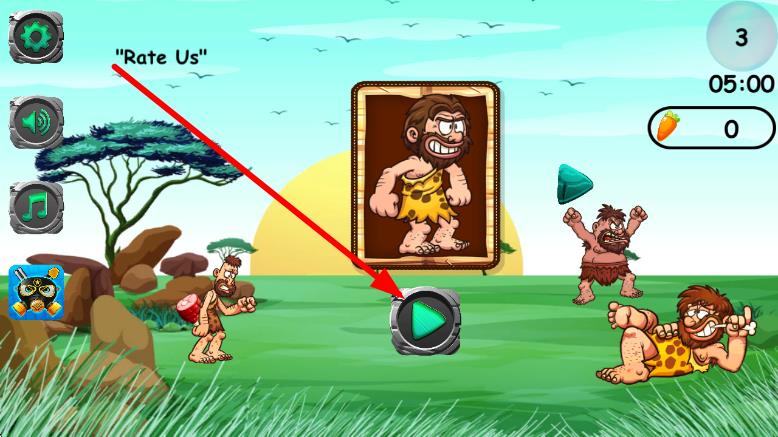 1、进入游戏主界面,点击中间绿色三角按钮,操控原始人角色开启冒险,按规则推进游戏。