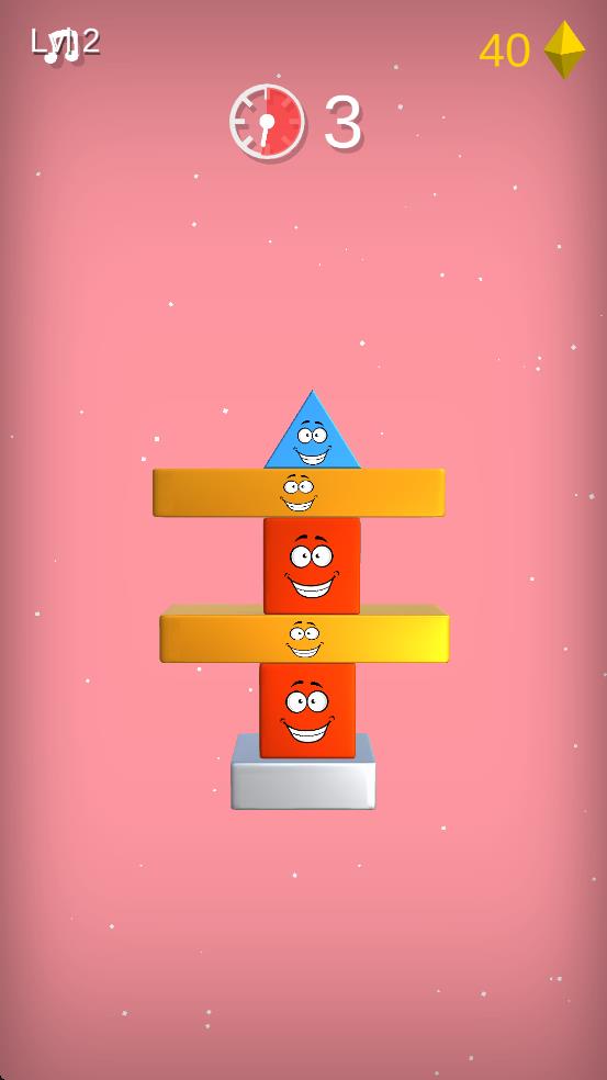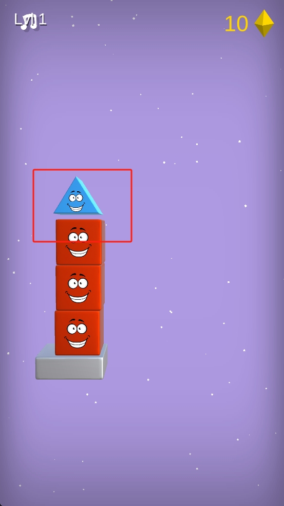 2、后续出现蓝色三角形、红色方块,在它们下落至下方堆叠物对齐瞬间点击,逐层叠加,保持平衡。