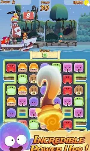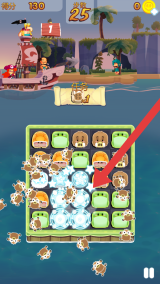 3、消除助力海盗:消除不同类型的方块能直接帮助海盗们在冒险中行动,或解锁技能击退敌人,或获取物资突破障碍,通过消除策略为海盗的冒险保驾护航,闯关策略性。