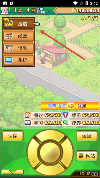 2、在游戏界面,点击建造选项,进入建造菜单,可选择环境,设施类别,规划露营地布局。