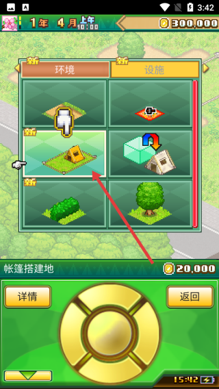 3、在建造界面,选帐篷搭建地等设施,花费金币如20,000建造,逐步完善露营地,提升游客接待能力。
