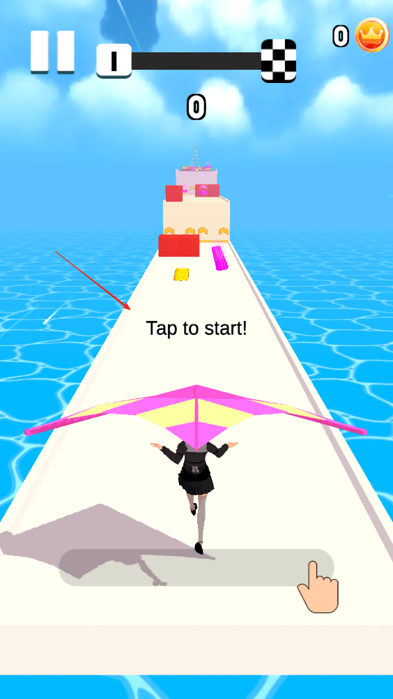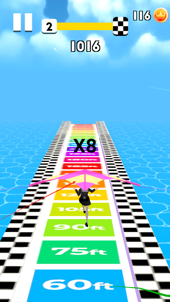 1、向前奔跑收集棍子碎片让棍子变得足够长的同时收集沿途金币当小人悬空时则会自动放出滑翔翼。