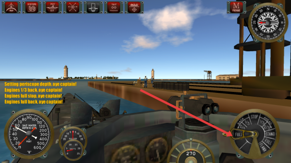 1、在驾驶舱,可以根据仪表盘来调整了潜艇的动力,按指令来操作引擎如1/3速、全速停等,控制航行。