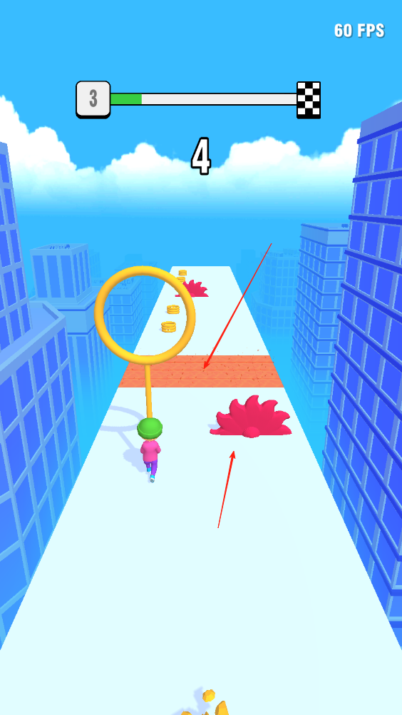 1、操纵小人收集散落在地的圈圈碎片,收集的越多,手中的圈圈越大,对后面的环节越有利。