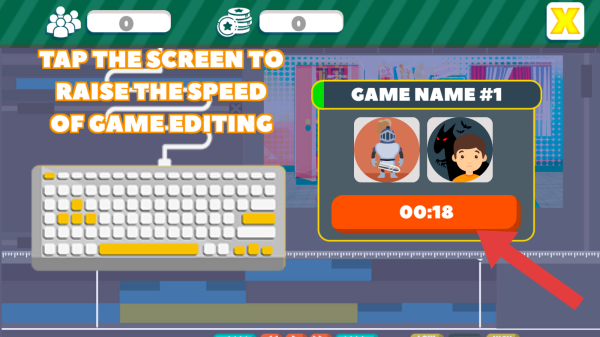 3、提示点击屏幕提升游戏编辑速度,右侧显示名为GAMENAME的已选RPG、Horror类型,倒计时00:18。