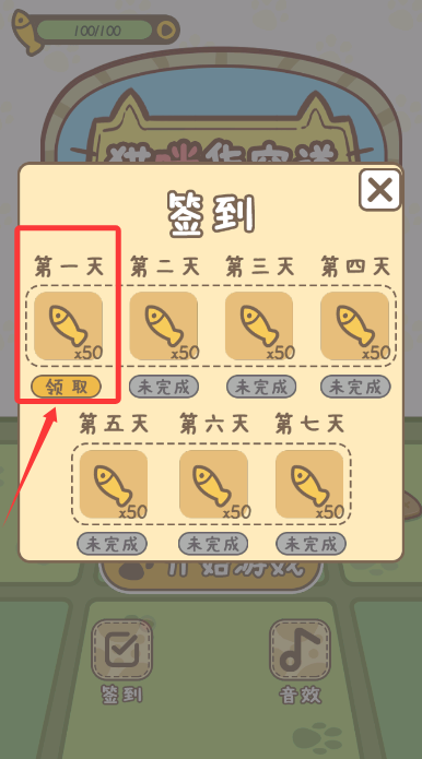 1、打开每日登录界面,轻触首日奖励图标,即可获得萌宠最爱的小鱼干礼包。