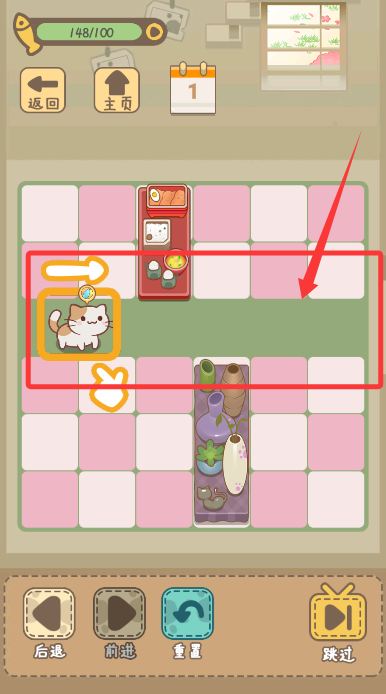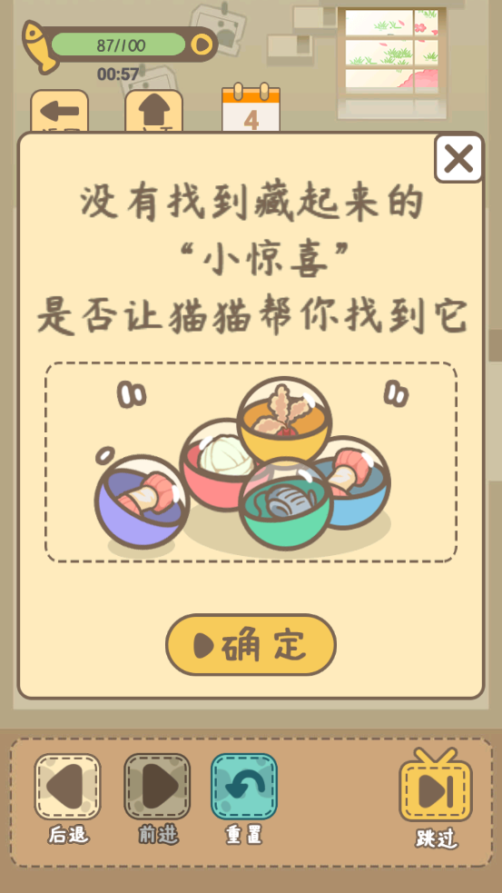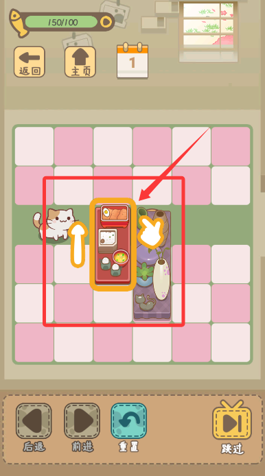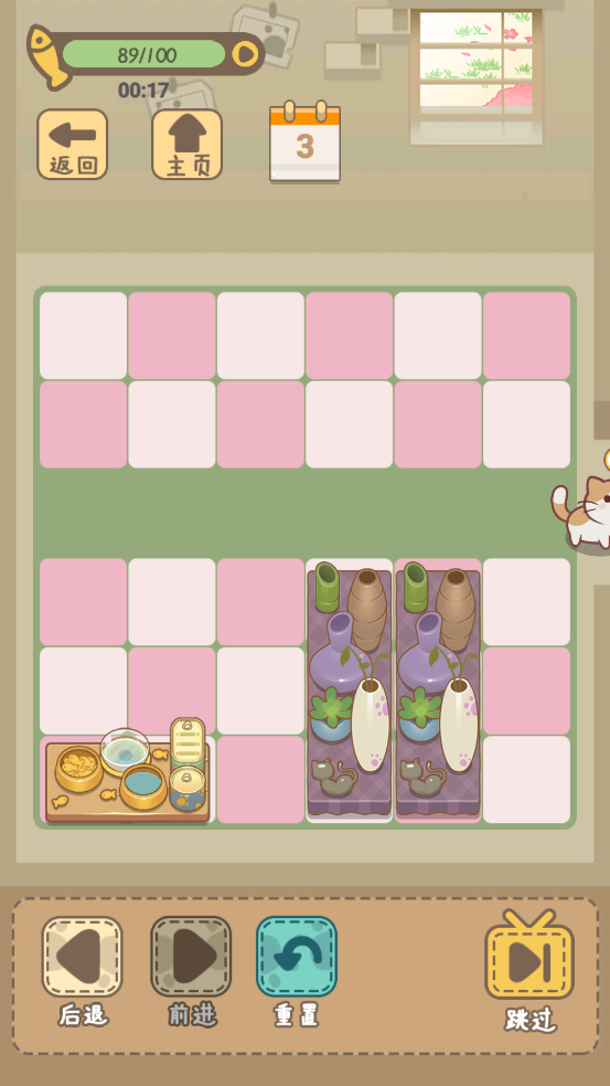 2、进入解谜场景后,调整食盆、玩具等物品位置,为猫咪设计最佳逃生路线。