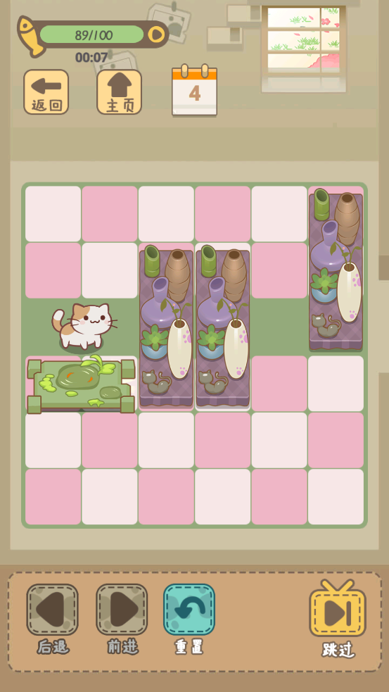 1、基础解谜操作,通过点击移除障碍物,滑动移动平台,为猫咪开辟安全路径,需要考虑移动顺序和空间关系,规划最优解。