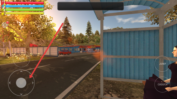 1、在公交站,点击方向的摇杆,需要按箭头指引移动,离开站点,前往目标区域,留意体力条。