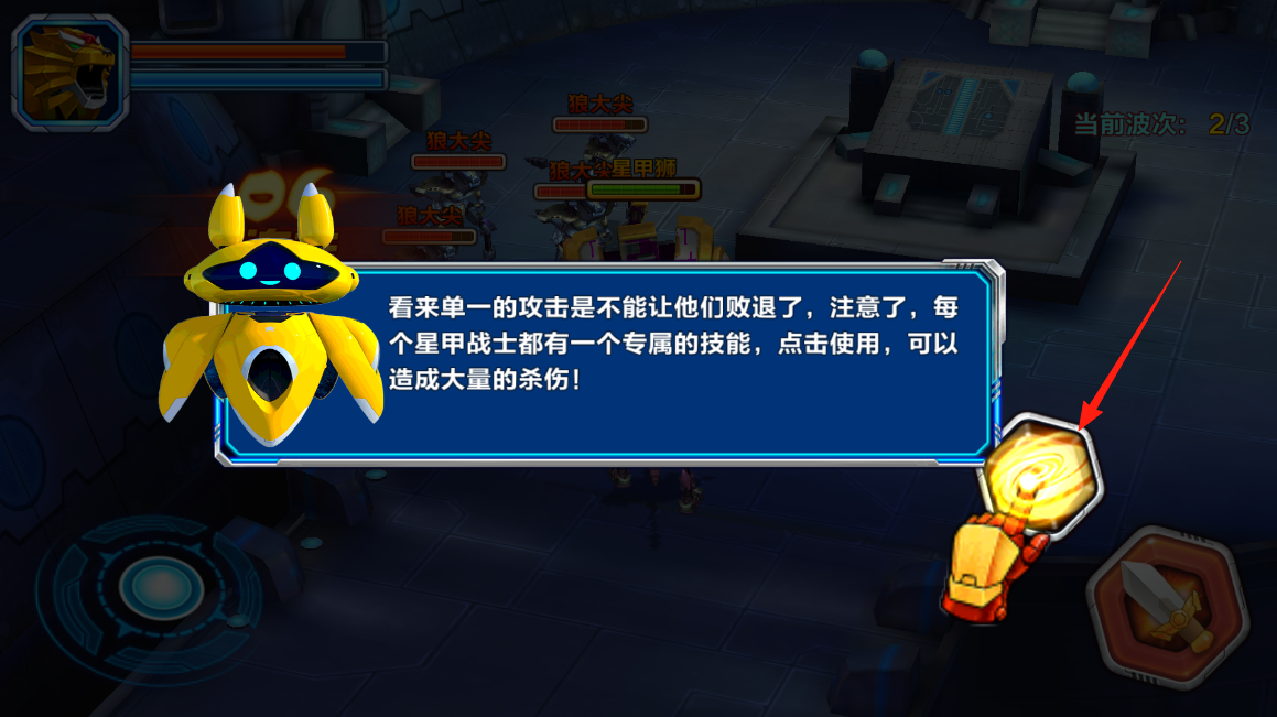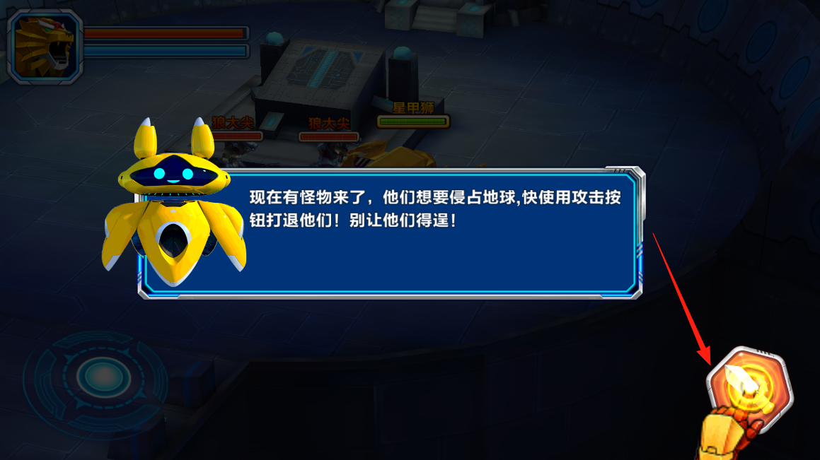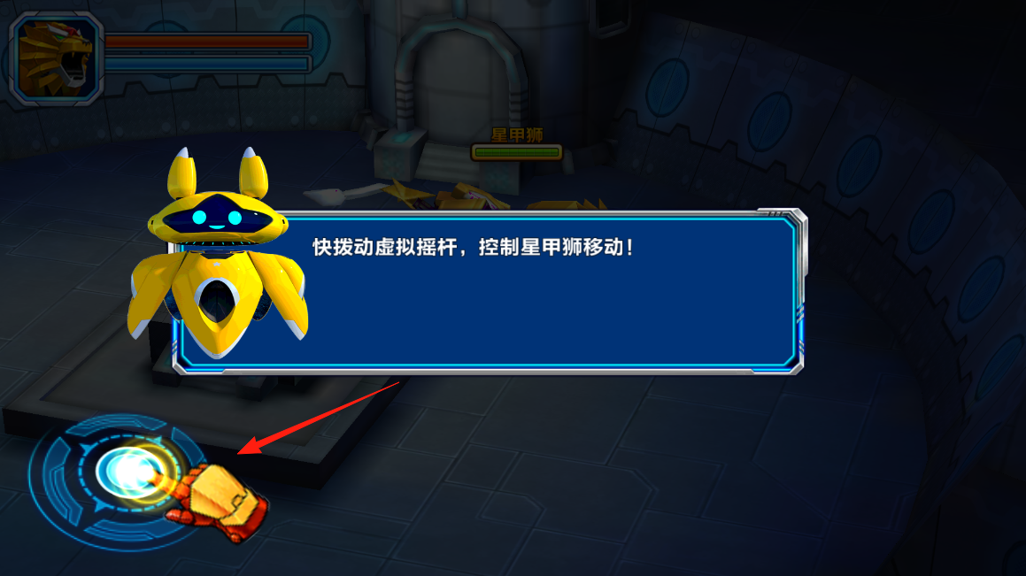 1、进入游戏,看到黄色星甲狮,按提示拨动左下角虚拟摇杆,控制它前后左右移动,在场景里到处逛逛,熟悉移动操作,为打怪做准备。