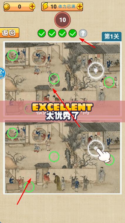 3、点击正确,出现绿色的圆圈标识,持续寻找并点击所有的差异之处,当成功找到指定数量的差异后,即可通关。