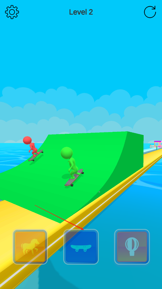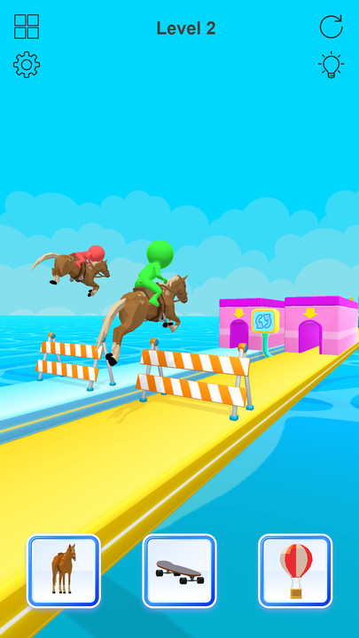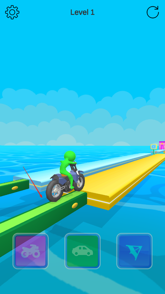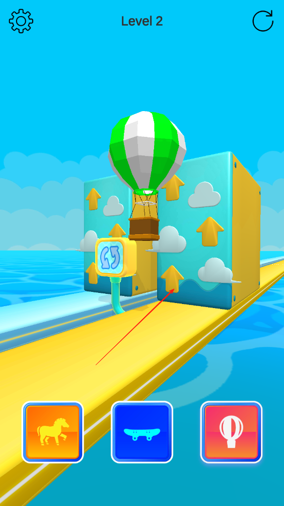 3、遇到越不过去的高墙障碍时,能选择的只有热气球,等到热气球飞起来越过去,更换载具冲过终点线完成关卡。