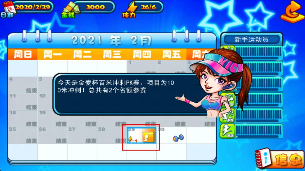 1、在日历界面,点击2月29日金麦杯百米冲刺PK赛图标,消耗1体力报名参赛,确认获取参赛资格。