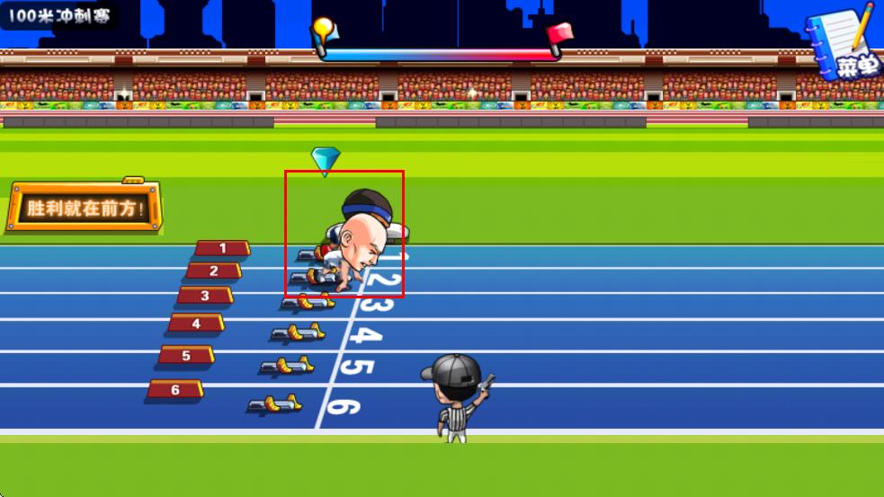 2、进入跑道场景,操控戴头带的运动员,在裁判发令后,通过点击或滑动屏幕,控制起跑、加速节奏,冲刺100米终点。