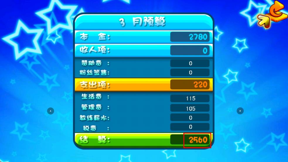 3、赛后查看3月预算界面,核对本金、收支项,确认结算金额2560,规划后续资金用于训练、生活等支出。