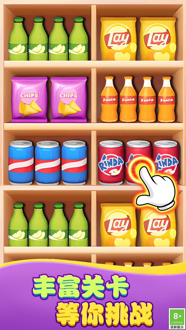 货柜收纳消消带来清爽整洁的收纳乐趣,化身仓库整理达人,将散落的商品分门别类归位,通过趣味消除玩法,把杂乱的货架变得井井有条,简单的操作搭配治愈音效,让整理过程充满成就感,从日常用品到生鲜食品等你来归类,享受从混乱到有序的奇妙转变。