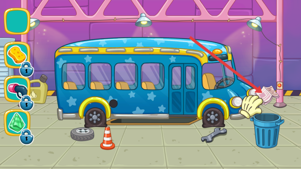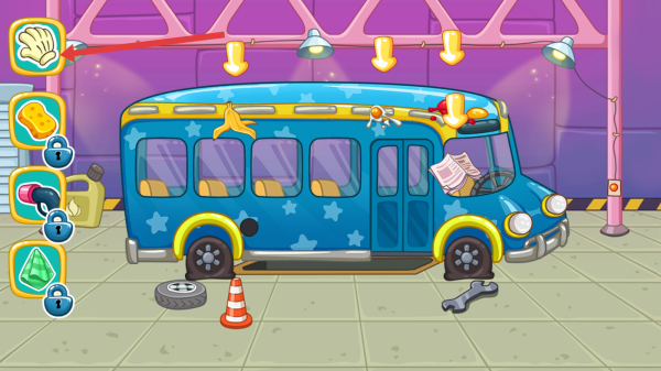 1、进入修理画面,点击左侧手套的工具,优先清理巴士上的香蕉皮、报纸等大的杂物,拖到垃圾桶。