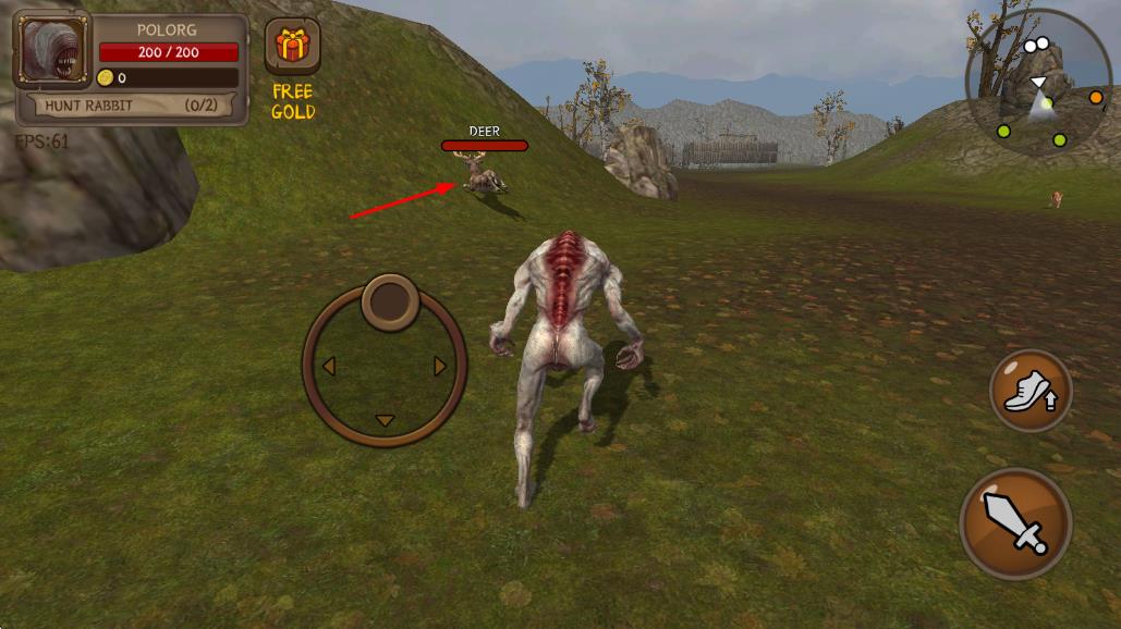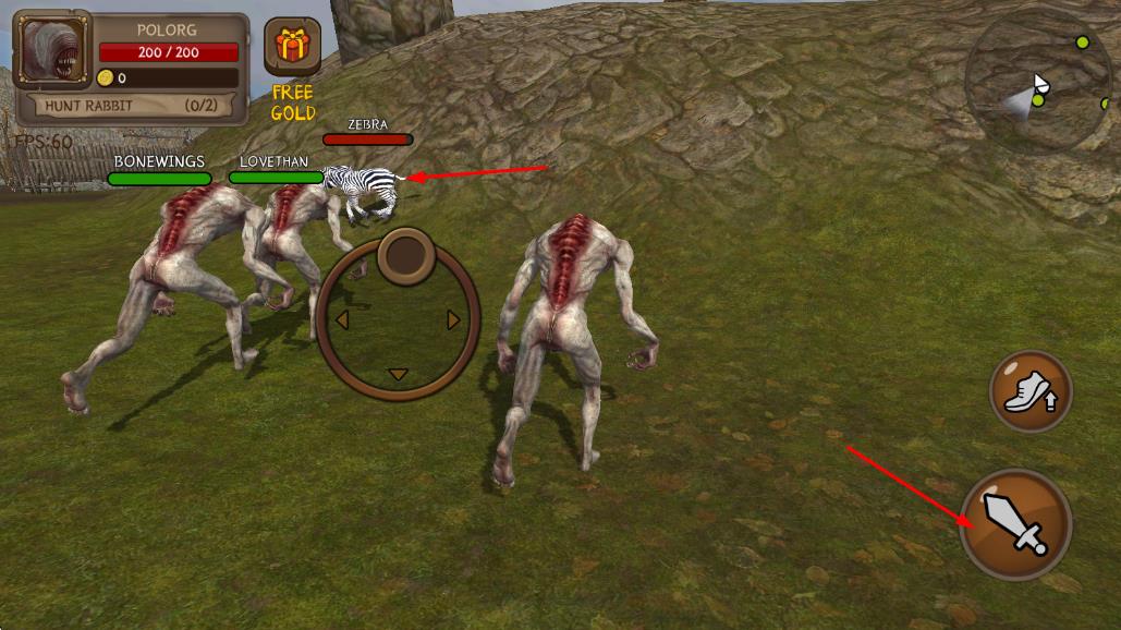 1、进入游戏后操控初始怪兽在地图移动,通过虚拟摇杆控制方向,靠近小型生物点击攻击键完成首次吞噬获取能量。