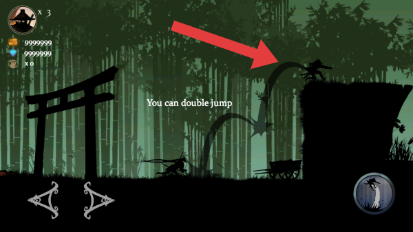 3、遇到前方有障碍物时,玩家可以通过文字提示进行双重跳跃,每到没遇到过得障碍都会跳出教程的指引。