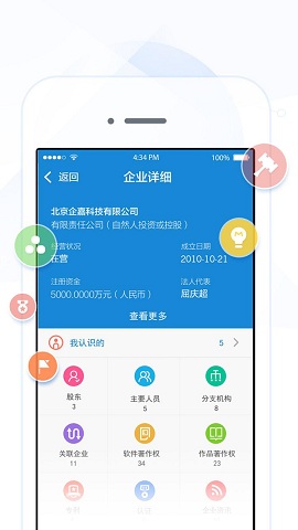 可查询公司名、经营状况、成立日期、注册资金、法人代表、股东、主要人员、分支机构、关联企业、软件著作权、作品著作权、专利、认证信息、企业资讯