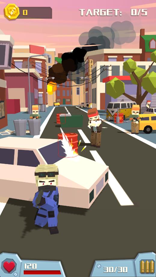 1、进入游戏,滑动屏幕左下角的虚拟摇杆操控方块特种兵移动,在城市街区穿梭,熟悉周边环境,寻找有利地形与初始武器。