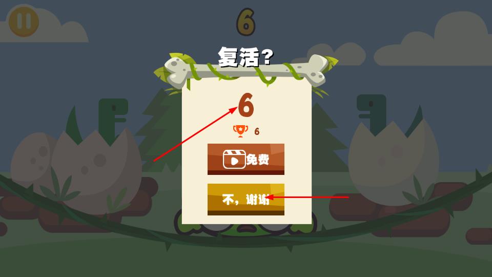 3、若角色失误,弹出复活?界面,可点击免费按钮观看广告复活,或选择不,谢谢,重新开始游戏,尝试刷新跳跃记录。