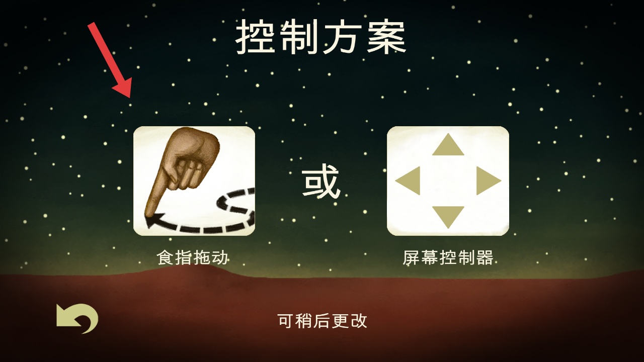 1、在控制方案选择界面,可以任选食指拖动或屏幕控制器操作模式,后续可更改,确定后进入游戏。