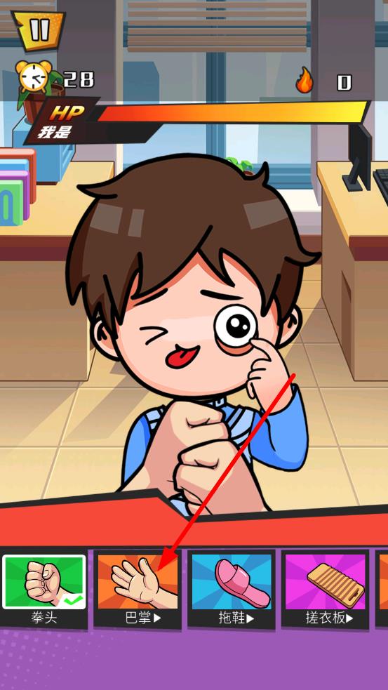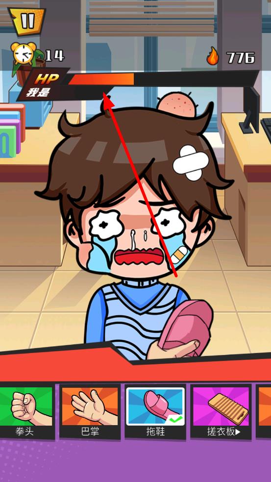 2、战斗中,观察角色HP条,灵活切换拖鞋、搓衣板等道具,不同道具的伤害都不同,玩家可以尽情发泄击打乐趣。