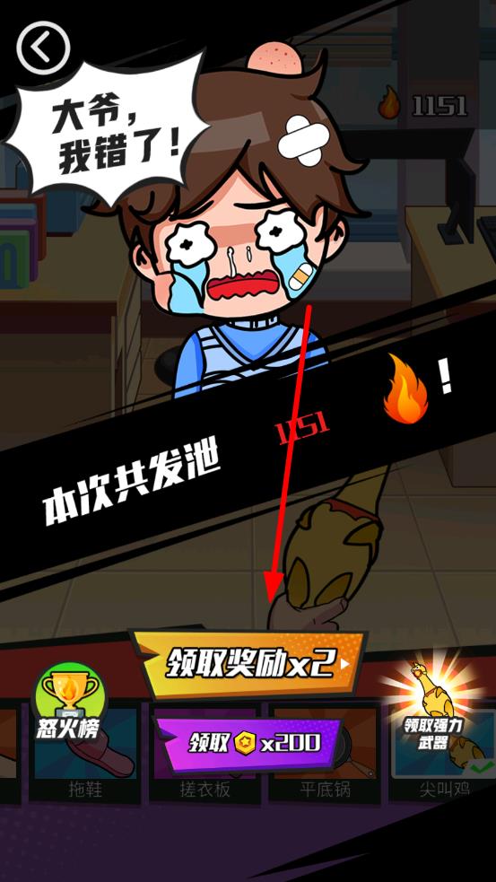 2、连击技巧:把握道具攻击后摇,快速切换下一个武器触发连击,拳头打完接巴掌,搓衣板收尾接拖鞋,连续攻击触发怒火倍增buff,短时间内攒满能量解锁新武器。
