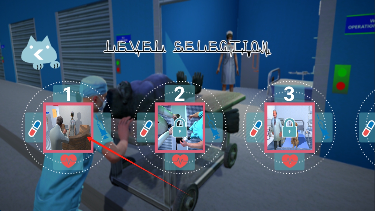 2、选择第1关,从基础任务开始,熟悉游戏操作和宠物医院环境,点击选择游戏关卡。