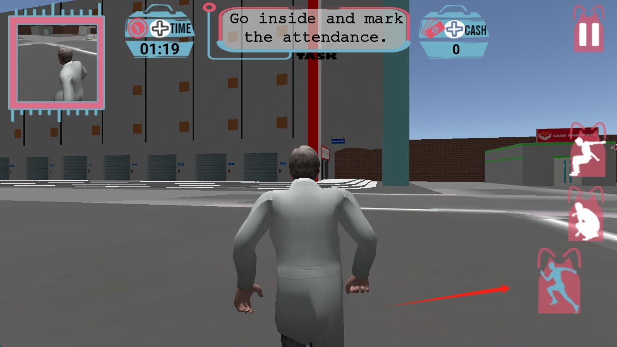 3、操控角色进入建筑内签到,关注剩余时间和现金状态,按任务要求推进游戏进程,点击奔跑。
