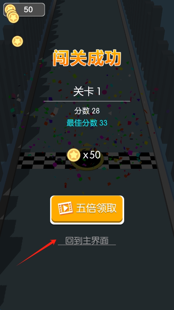 3、成功通关后,可根据需求选择五倍领取奖励,获取更多金币;若不想继续,点击回到主界面,准备开启新的挑战。