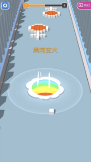 2、游戏中,操控黑洞尽可能多地收集方块,注意观察前方计分牌,了解收集数量与目标数量的差距,同时留意关卡进度条。