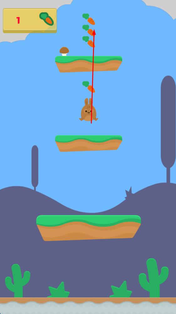 1、进入跳动兔,观察初始阶梯的分布与胡萝卜的位置,轻轻点击屏幕,让小兔子完成第一次向上跳跃,开启这场收集与避险的旅程。