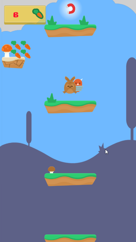 3、随着跳跃高度增加,阶梯分布更复杂,小怪物出现频率更高,需精准把控点击时机,让小兔子在安全跳跃中收集更多胡萝卜,挑战更高高度。