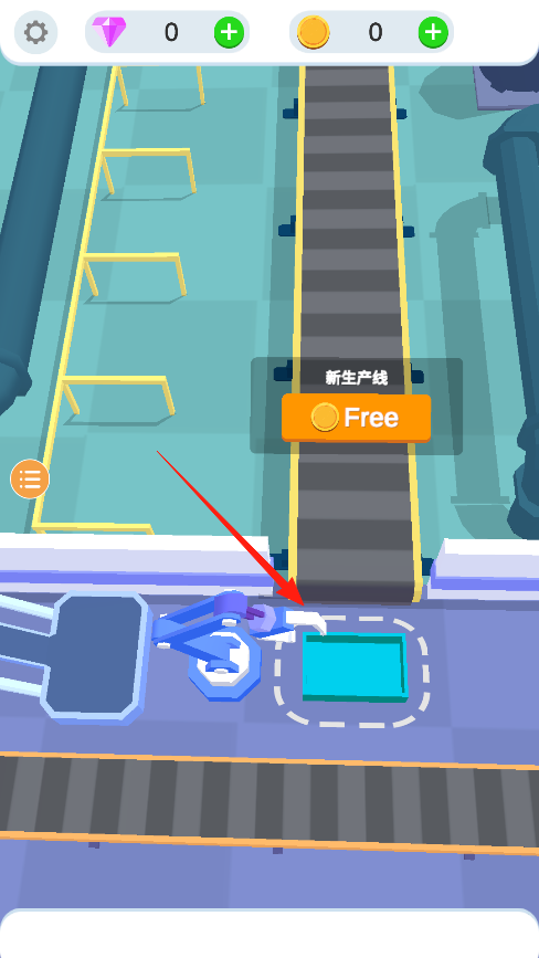 1、点击那个Free按钮就能免费开启第一条生产线,传送带会开始运送产品,注意看蓝色机械臂的工作区域,把产品准确放到虚线框里才能算有效生产,刚开始要多试几次找准位置。
