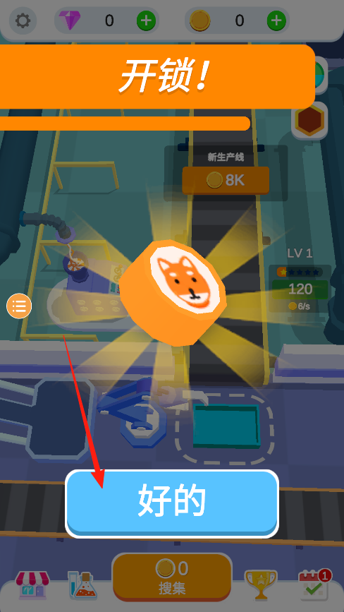 2、攒够8K金币就能解锁这条带狐狸标志糖果的新产线,点好的按钮确认后就能投入使用,新产线每小时能多产出6个产品,升级到LV2后效率还会更快,记得经常回来查看生产进度。
