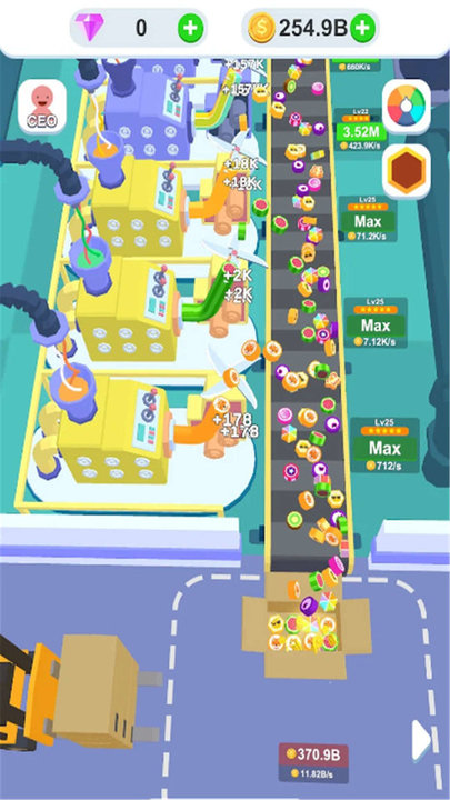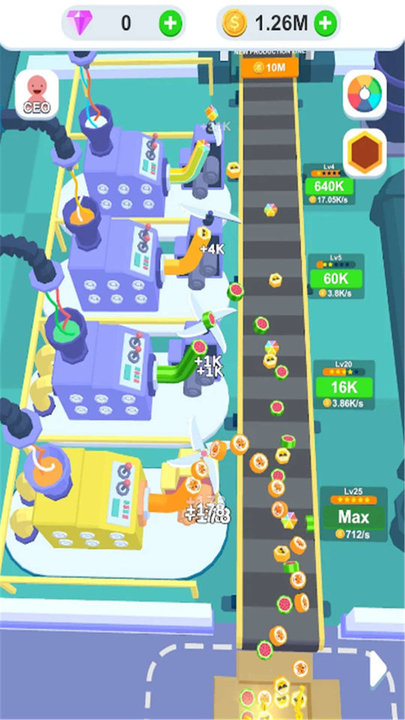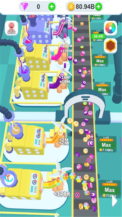 2、升级设备开设新厂:提升单个流水线的产能和效率,积累到一定程度后开另一家工厂,生产更多种类或数量的糖果,让商业版图不断扩大,实现收益的持续增长。