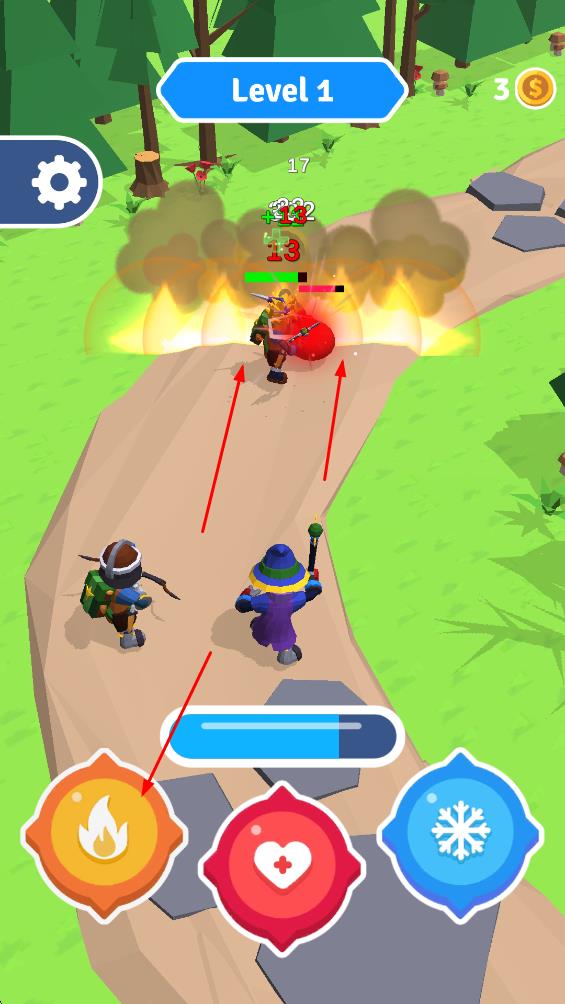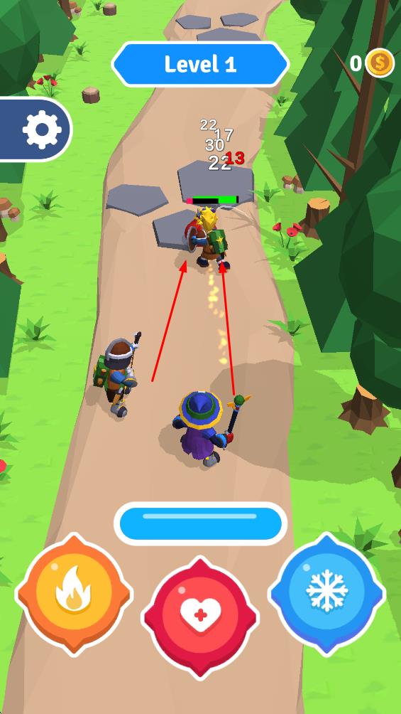 1、操控巫师、弓箭手等角色在森林路径前进,遭遇持盾等类型怪物,开启Level1关卡挑战。