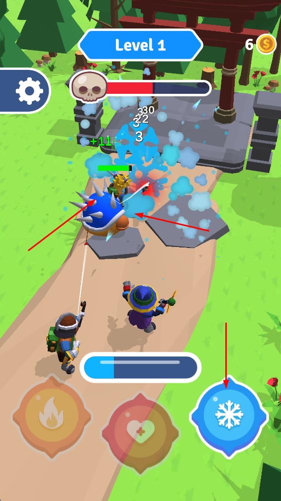 3、遇到带刺等不同怪物时,点击蓝色雪花图标释放冰冻技能,造成伤害,持续推进关卡。