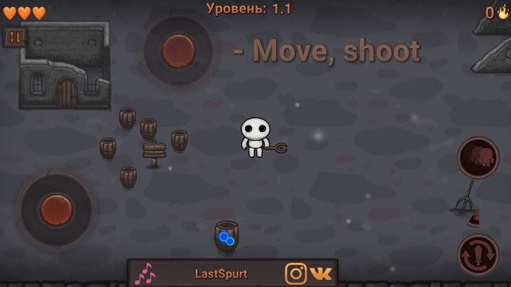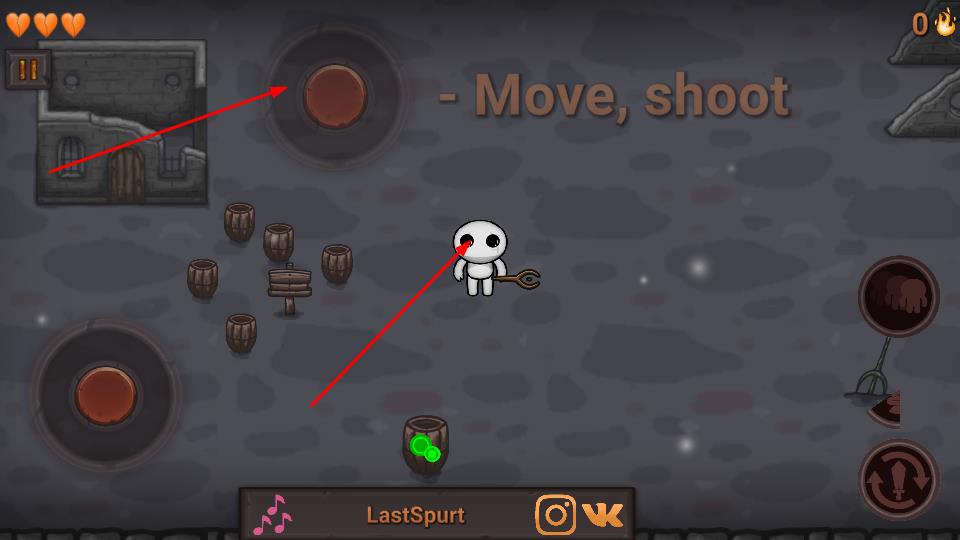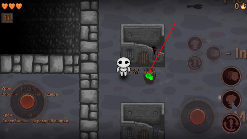 2、探索地图破坏木桶获取绿色道具,解锁新技能,留意石墙、建筑布局,规划移动路径,消灭敌人如红色眼怪,维持左上角爱心血量,避免归零。