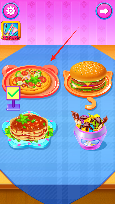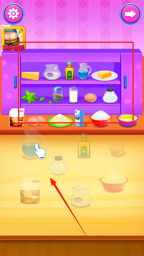 2、紫色橱柜里的食材都可以随便拿,点一下就能放到黄色台面上备菜,右上角箭头是确认按钮,等所有需要的材料都摆好后再点它进入下一步。