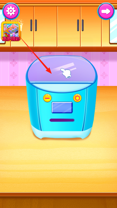 3、那个蓝色电器上的紫色盖子可以掀开,点白色手形图标就能看到里面藏着的食材,显示屏会提示需要放什么材料进去,按○按钮确认后电器就会开始工作啦。