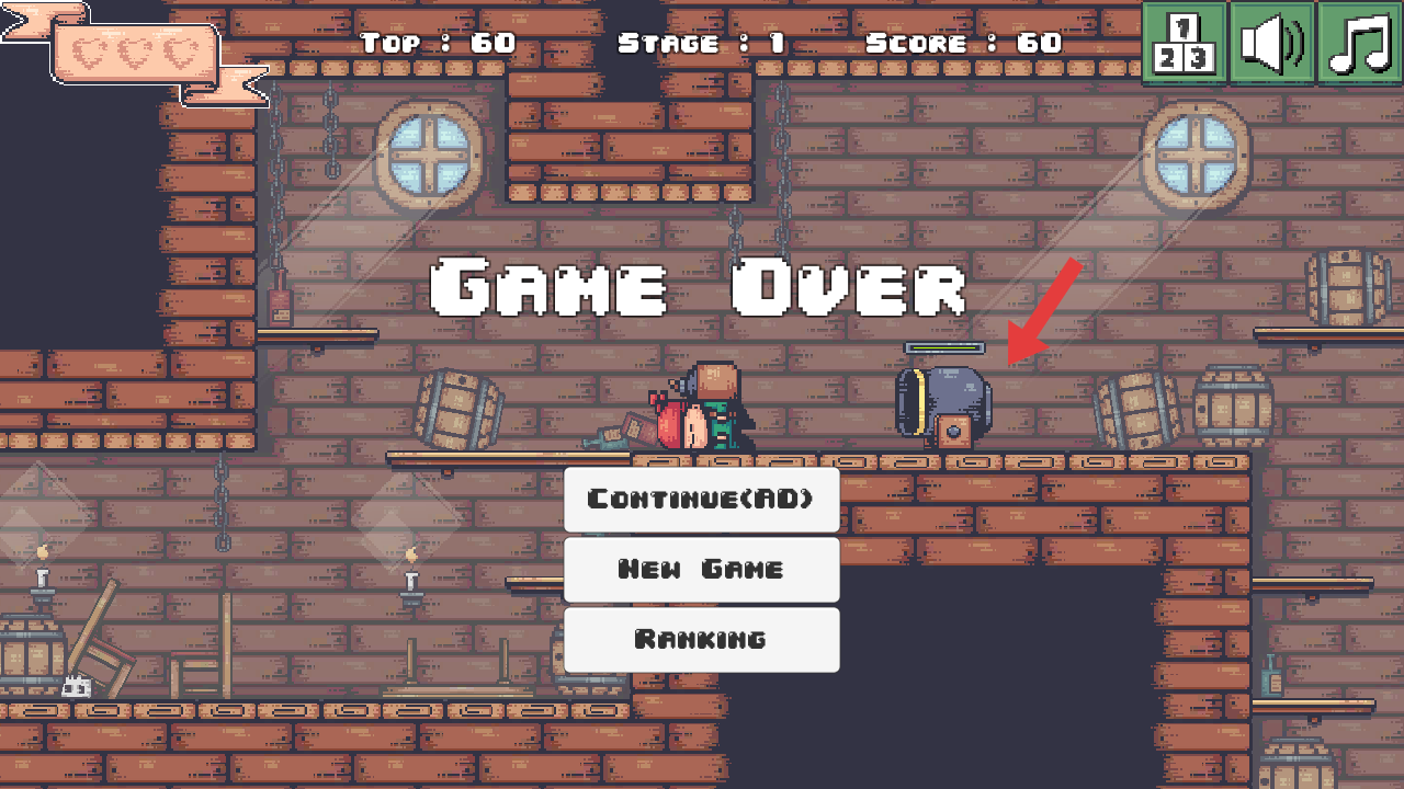 3、如果被大炮击中则三条性命全部清零,显示游戏失败界面,点击NEW GAME的选项,重新开始挑战关卡。